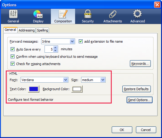 In the next dialog box select Composition tab and then select General tab. In the General tab change font name to desire font name. Also change font size, color and background color for the font. Now click on Send Options button.